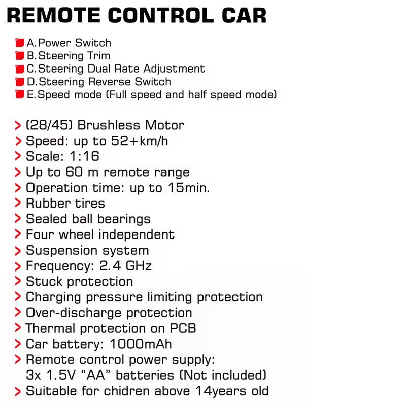 1/16 scale RC car with a top speed of up to 52 km/h, delivering an exciting and dynamic driving experience. -