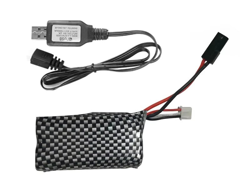 Comes with a 7.4V 1000mAh Li-ion battery, offering about 15 minutes of play time with a charging time of around 60 minutes. -