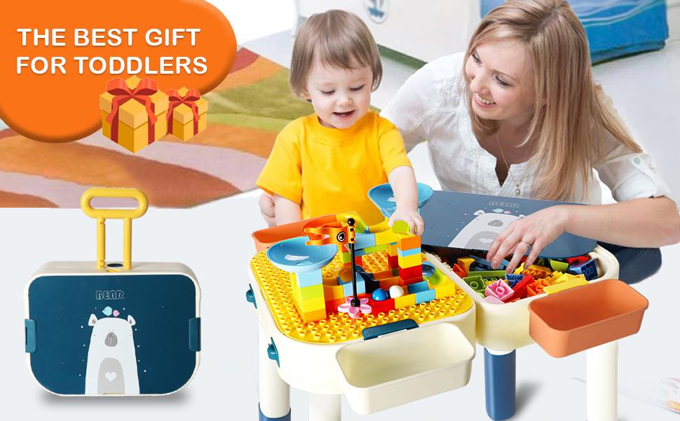 - Multi Activity Table compatible with popular plastic building blocks and Duplo-blocks and includes a removable cover, and 60pcs big building blocks.